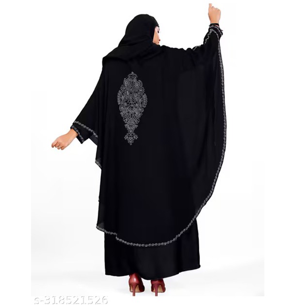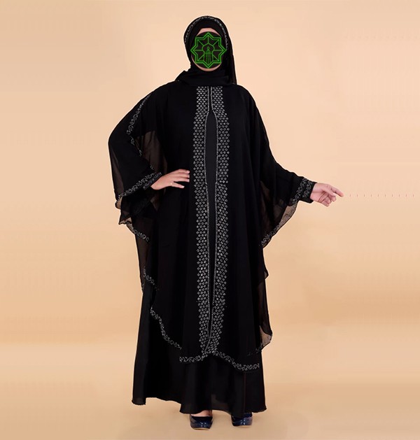 Unveiling elegance: This stunning abaya features a double-layered black burqa with a matching hijab, all crafted in a luxurious 56-inch length and a comfortable 44-inch size. The true showstopper is the intricate bead and stonework, meticulously hand-designed from the bottom hem all the way up to the top. This abaya is not just modest, it’s a captivating statement piece, sure to turn heads.