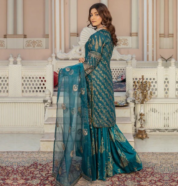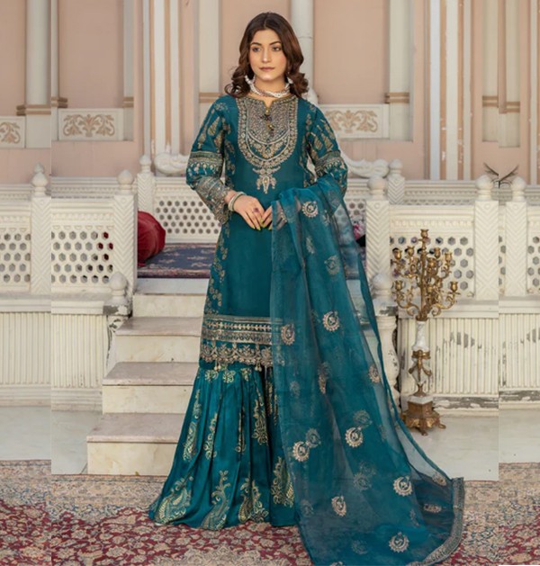 The Ethereal Charm Zinc 3-piece chiffon sharara suit is a masterpiece of elegance and sophistication. The ensemble features a beautifully crafted chiffon kurti in a soft zinc hue, adorned with intricate embroidery that adds a touch of timeless charm. The matching sharara pants, with their flowing silhouette, enhance the outfit’s grace, while the chiffon dupatta, delicately embroidered, drapes effortlessly to complete the look. This sharara suit is perfect for making a statement at any special occasion, combining tradition with a modern, ethereal appeal.