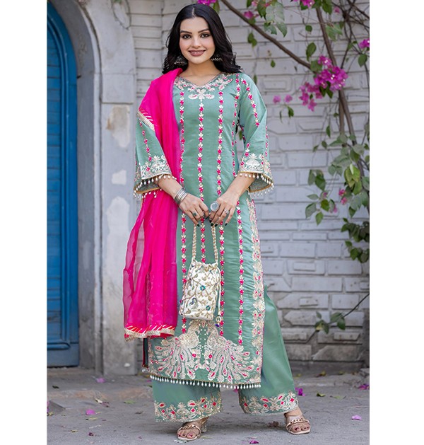 The **Green Navy Blue Women Suit Set** is a stylish and elegant ensemble, perfect for any occasion. Featuring a beautifully designed palazzo and kurta set, it offers a blend of comfort and sophistication. The rich green and navy blue hues enhance its appeal, making it a must-have ethnic outfit.