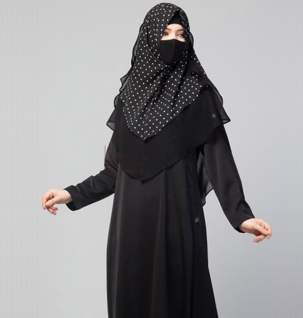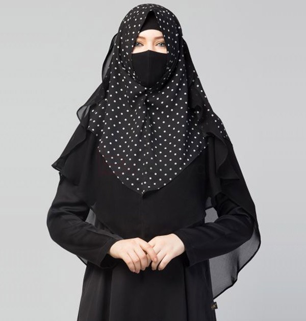 Crafted beautifully in black, paired with polka dot fabric, this elegant khimar features layered high-quality georgette, making it suitable for both hot and cold weather. The one-size design ensures it fits comfortably on sisters of all sizes. These hijabs are pre-sewn and ready to wear.