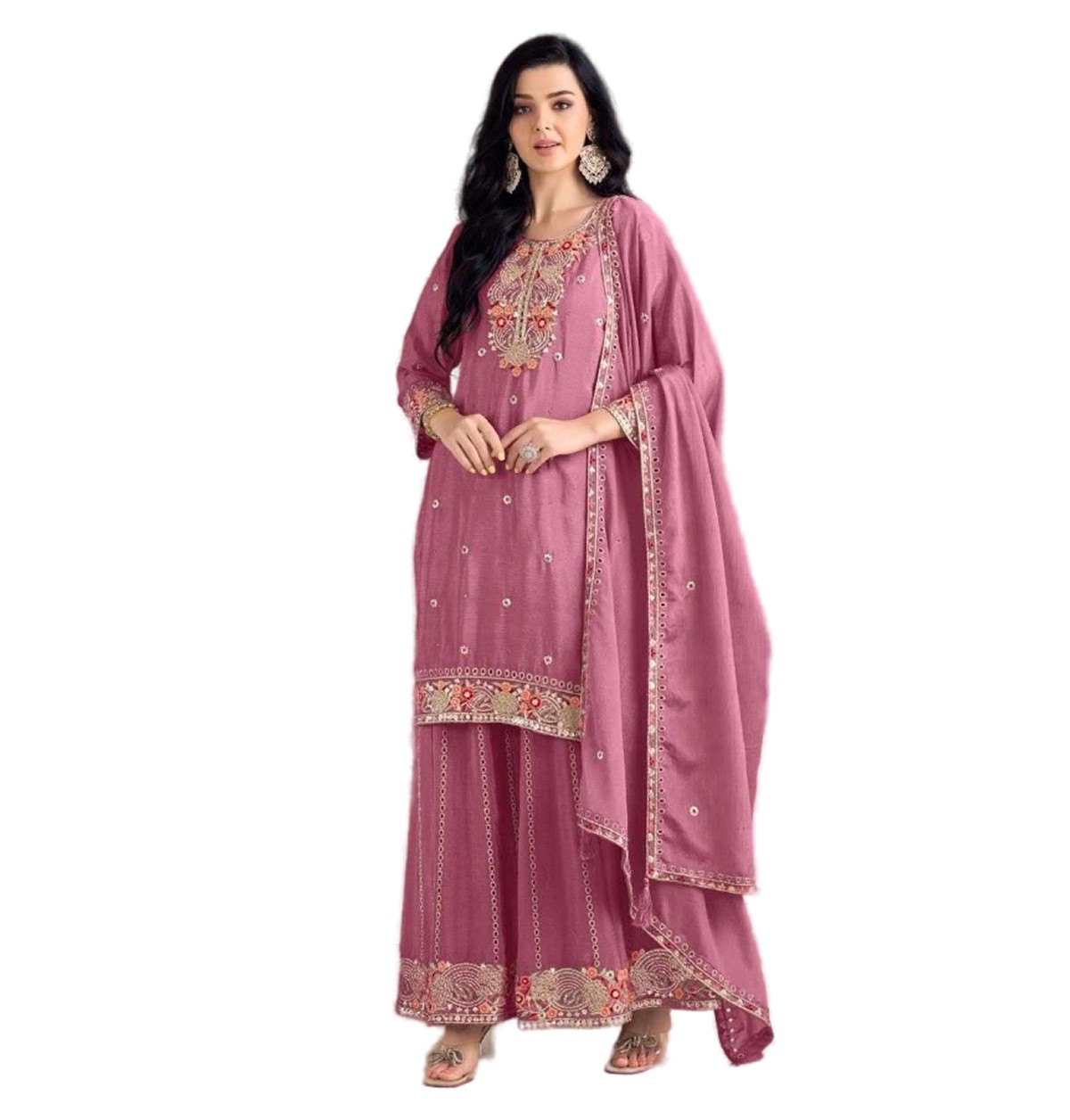 Fabric Detail: Top – Chinon With Heavy Embroidery And Handwork Bottom – Chinon With Embroidery Work, Inner American Crape Dupatta – Chinon With Embroidery Work