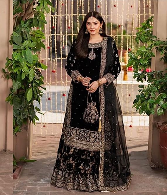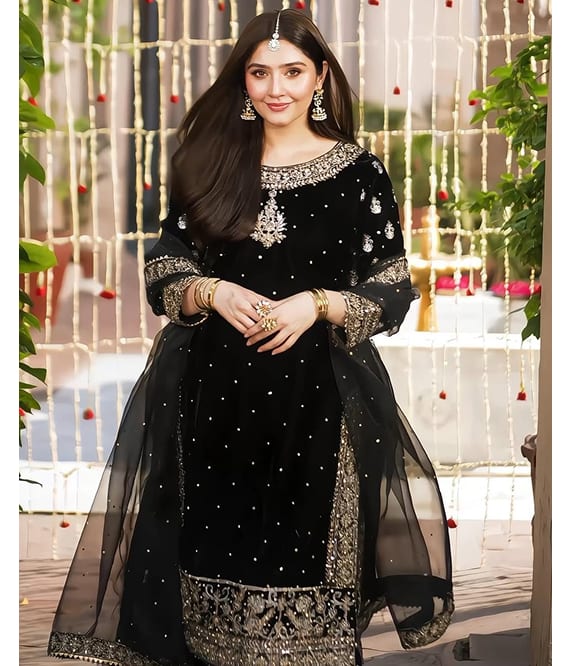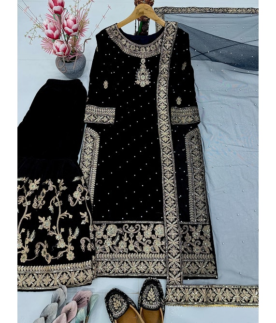 This luxurious Sharara set features heavy 9000 velvet fabric adorned with fine embroidery and Chinese sequence work for a royal look. The fully stitched, free-size Sharara (39 inches) ensures comfort with elegance. Paired with a heavy faux soft net dupatta, embellished with embroidery, sequence detailing, and rivet moti handwork, it adds a graceful charm. Perfect for weddings, festive occasions, and parties, this ensemble beautifully blends tradition and glamour for an effortlessly elegant appearance.