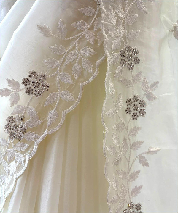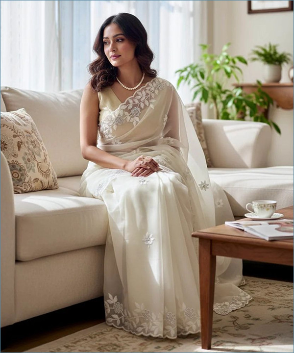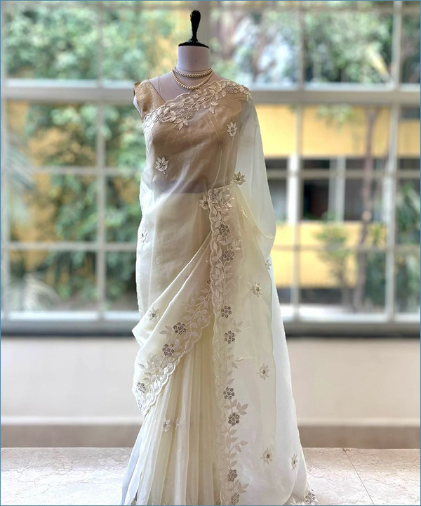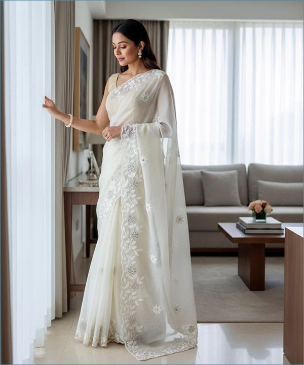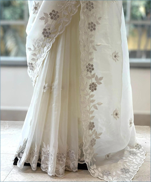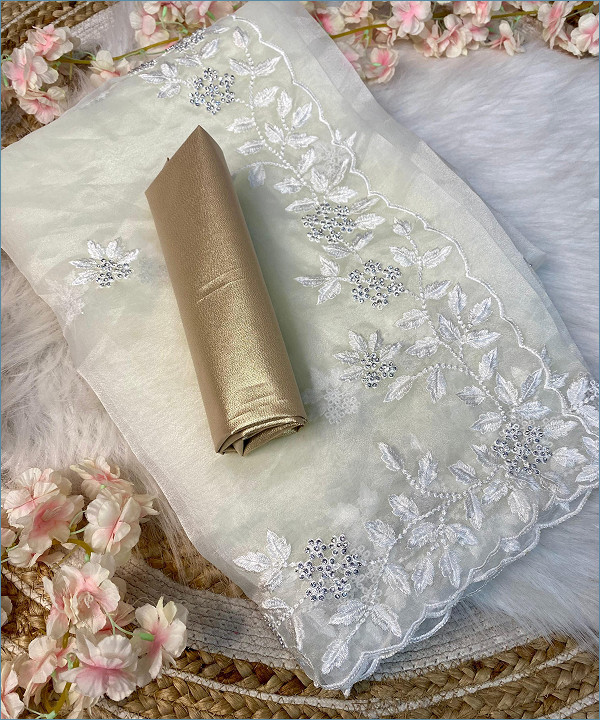 Turn heads with timeless elegance in this Pure Organza Saree, designed for women who love subtle glamour with a luxurious touch. Crafted from premium organza fabric, this saree features intricate all-over thread embroidery enhanced with shimmering Siroski work, creating a graceful and eye-catching appeal.