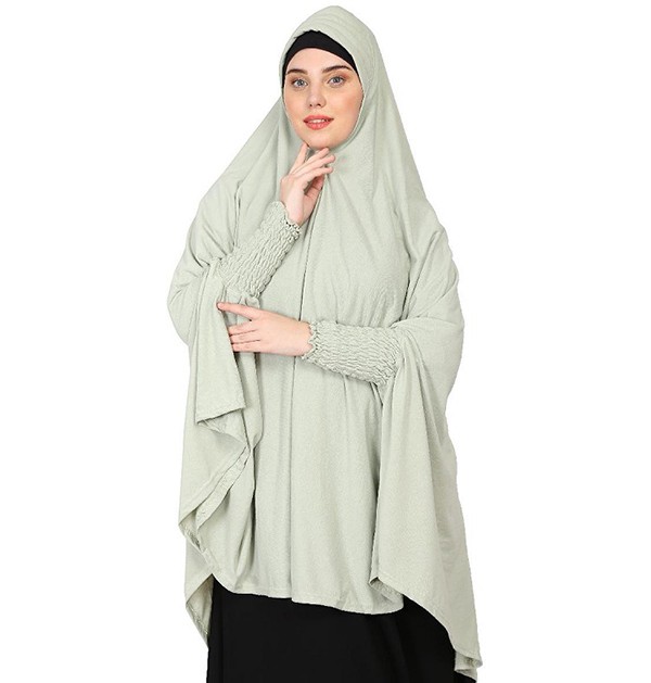 Surrender to serenity in prayer with the Stretchable Jersey Smoking at Sleeve Sage Green Prayer Khimar Hijab. Crafted from soft, breathable jersey fabric, this elegant sage green hijab offers a comfortable, stretchy fit that conforms to your head shape without restriction. Delicate smocking details on the sleeves add a touch of style, while the stretchy material allows for ease of movement during various prayer postures. The calming sage green hue promotes a sense of peace, perfect for focused devotion.