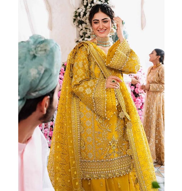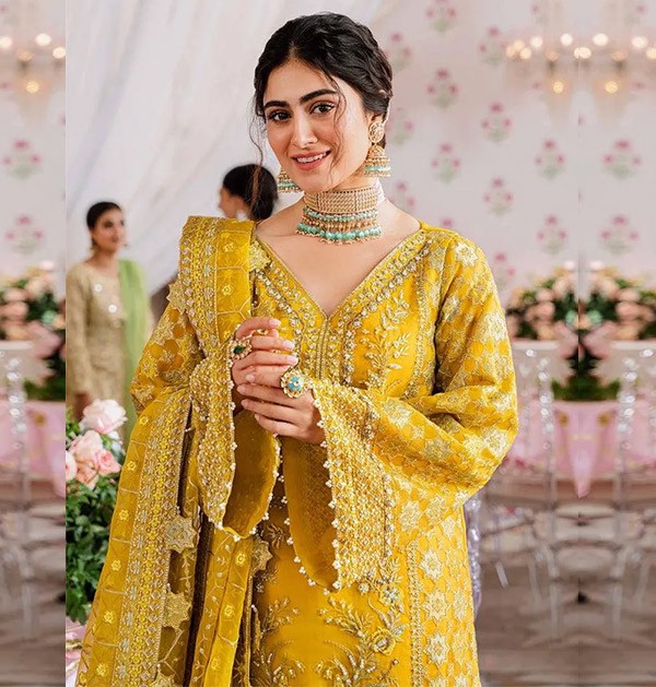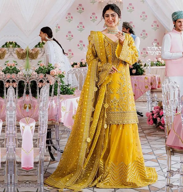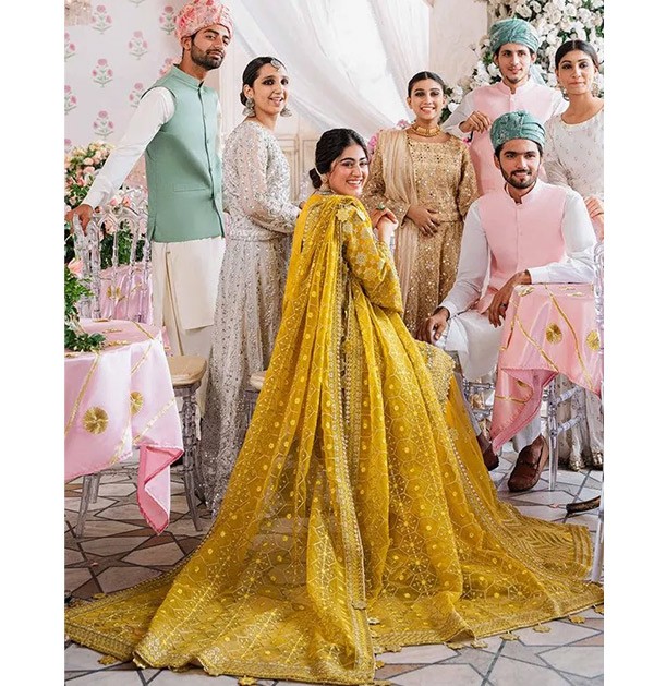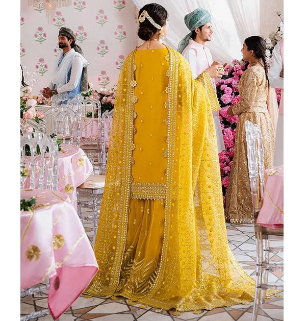 Original Indian Mehndi dress, a wedding suit featuring intricate embroidery in a maxi frock style. This luxurious yellow outfit is perfect for Eid parties, Dholki, Mayu, Mehndi, and Sangeet ceremonies, making it an ideal choice for guests seeking elegance and cultural style
